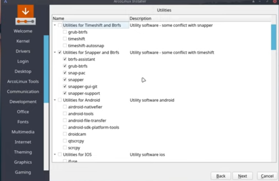 Sona doğru size btrfs - snapper seçenekleri gelecek ve aşağıda paylaştığım şekilde seçim yapnız. Başka bir dosya ilk planda başka seçim yapmayınız.