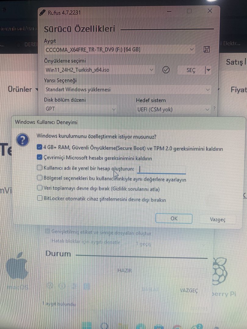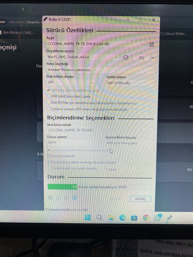 Rufus'tan yazdırırken TPM2.0 desteğini kaldır olan seçeneği aktif ettiğinden emin misin? Aktif et ve videodaki adımları uygula.