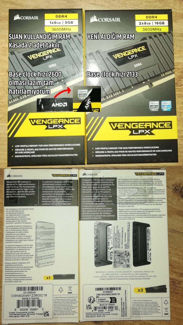Benim kasamda takılı olan RAM'lerin base Clock'u 2600MHz'miş yeni aldıklarım 2133MHz'miş arkadaşlarım ile baktığımızda onlar bana söyledi. Ben alırken base clock farkı diye bir şey bilmiyordum. Bu iki RAM'i bir biriyle uyumlu bir şekilde 3600MHz'de çalıştırabilmenin bir yolu var mı yoksa iade etmek daha mı mantıklı? Bu olaylar başıma geldikten sonra RAM'leri altığım siteye baktım teknik özellik kısmında base clok için herhangi bir ibare bulunmuyor daha sonra kasayı aldığım siteye baktım orada da kasa içerisinde ki RAM'ler için herhangi bir base clock ibaresi bulunmuyor. Ben bu işin içinden nasıl çıkabilirim?