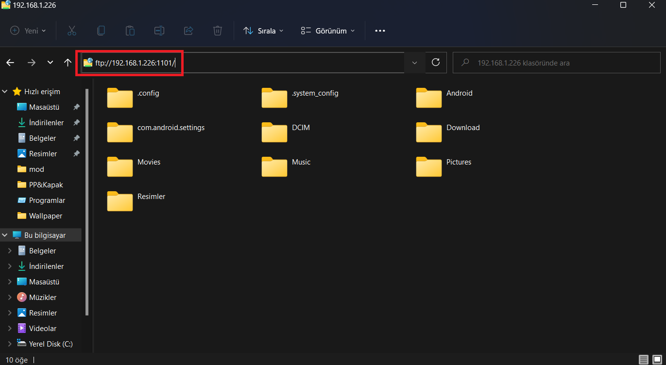 Windows'ta herhangi bir dosya gezgini ile bağlantıyı kurabiliyoruz. Örneğin bilgisayarım klasörüne girdikten sonra üst bölümden dosya dizininin olduğu yere tıklayıp FTP'nin size verdiği bağlantı adresini yazıyorsunuz. (Şifre sorarsa bir şey yazmadan devam edin.)