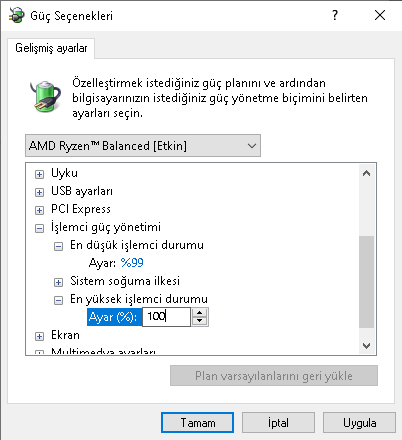 Hocam güç planından işlemci max kullanım değerini %90'a çekip deneyebilir misiniz? Benim Pc sıcaklıktan kapanırken bu durum geçici olarak idare etmişti, sonra tabi fan değiştirdim temelli çözdüm. Sizde bir deneyebilir misiniz?