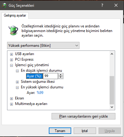 Güç seçenekleri > işlemci güç yönetimi > en düşük ve en yüksek işlemci durumu %99 işaretliyken aşağıda bıraktığım videoda daha önceki attığım videodaki sorunum ortadan kalkıyor (FPS drop yemiyorum) fakat bu sefer de 10-15 FPS kaybediyorum. CS:GO'da çok daha fazla FPS kaybında yol açıyor.