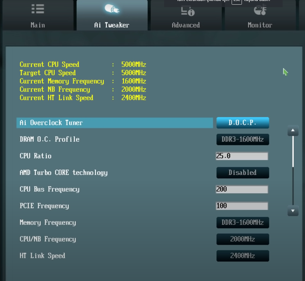 BIOS'ta AI tweaker bölümünde CPU ratio var. Onu değiştirmen gerek. Fotoğraf sadece örnek için. Sakın bu değerleri uygulama. FX X6 6300'ün base frekansı zaten 3.5 GHz. Fotoğraftaki gibi CPU bus Frequency kısmı 200 olmalı. 200 ise yukarıdaki CPU Ratio'yu 19.0 yaparsan 200*19 = 3800 eder o da 3.8 GHz demektir.