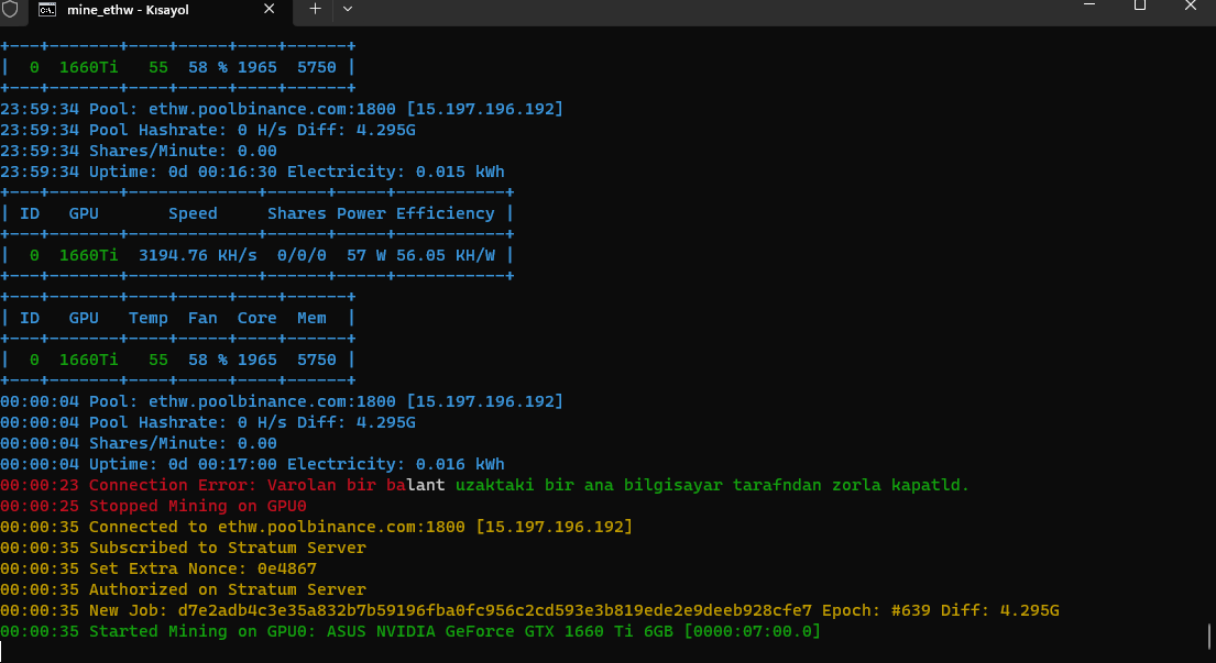 Arkadaşlar var olan bağlantı hatası neden ve pool hasrate 0 görünüyor? Birkaç saattir böyle, nasıl düzeltebilirim? Son olarak bu diff ne?