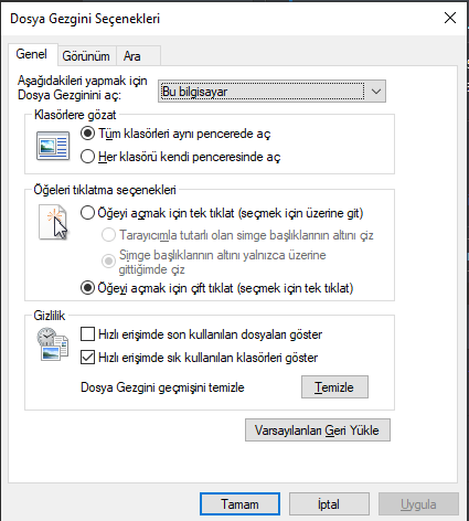 Windows'un arama kutusuna "Dosya gezgini seçenekleri" yazın ve tıklayın. Açılan pencerede orta kısımda "Öğeleri tıklatma seçenekleri" kısmından "Öğeyi açmak için çift tıklat" seçeneğini seçin, "Uygula" ve ardından "Tamam" seçeneğine tıklayın.