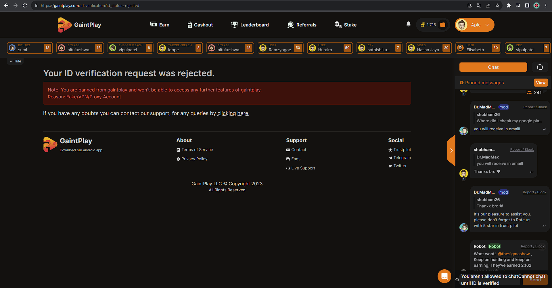 İnternetten oyun oynayarak para kazanmayı vadeden siteler görmüşsünüzdür, işte gaintplay de onlardan biri fakat dolandırıcı, en azından ben dolandırıldım. Vakit, emek harcayarak 1,34 dolar biriktirmiştim, o zamana kadar hiçbir sorun yoktu. Para çekme talebi gönderdim, saat akşam 11 de. Sabah bir baktım benden kimlik bilgileri istiyor, sonra da proxy veya VPN kullanımından banlandığımı gördüm. Ardından destekle iletişime geçtim. Başta kaldıramayız maalesef gibi şeyler söylediler. Bir kere daha yazdım yine aynısı. Fakat bir daha gönderdiğimde kimlik doğrulaması yaparsanız banınız açılır diye yanıt aldım. Bunu doğrulamak için bir daha gönderdim ve farklı biri daha aynı şeyi söyledi. Bende orada kalan paramı almak için doğrulama için gereken fotoğrafları gönderdim. 1,34 dolar takılmıştı, 1,7 dolarda para çekimi talebi attıktan sonra bir tekliften görüp tamamlamıştım, ödülün 24 saat içinde geldiğini söyleyen bir yazı vardı. Bu nedenle o para orada sıkıştı. Sonra destekten farklı biri buna rağmen banımın açılmayacağını söyledi. Biraz daha konuştuk, ama yok açılmaz dedi. Sonrasında siteye girdiğimde fotoğraftaki gibi bir durumla karşılaştım.