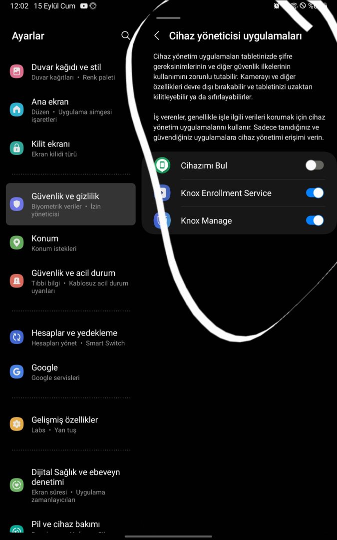 Hocam sence aklımıza gelmedi mi? Tablet Knox ile öğrenci tableti olarak yazılımlanmış. Mevzu o. Yoksa ROM atmakla uğraşmazdım ki. ROM atmama rağmen düzeltemedim. Bir sorun teşkil etmiyor aslında ama siliniyor mu merak ettik. Öğrenci modu açık yani tablette. Oyun vs. falan her şey sorunsuz yapılıyor da siliniyor mu merak ettik.