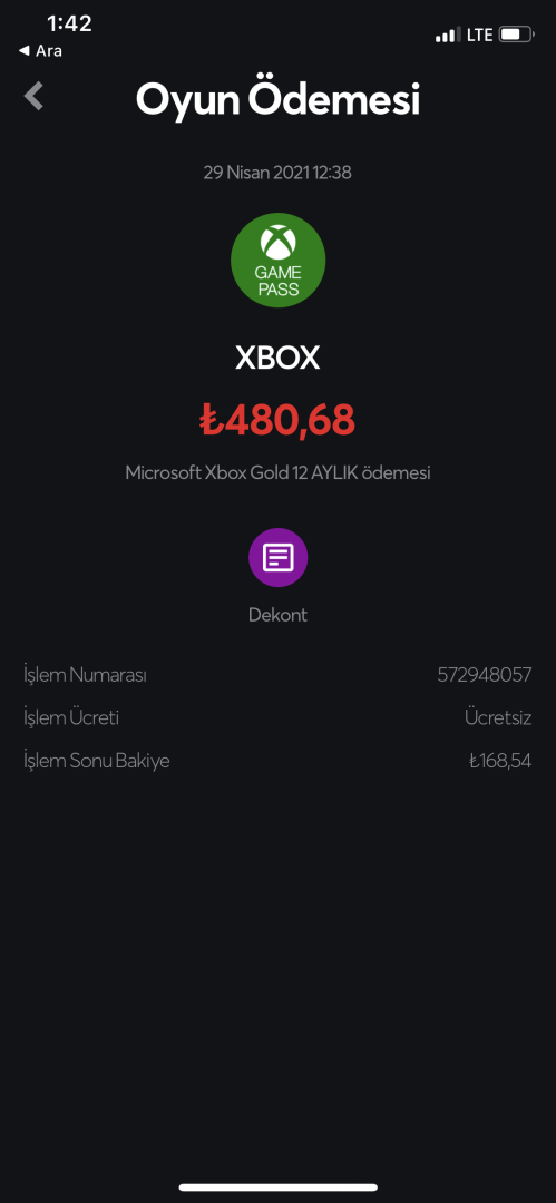 Kartı ekledikten sonra içinden 24 TL çekti ve hesap 3 yıllık Game Pass Ultimate'e yükseldi.