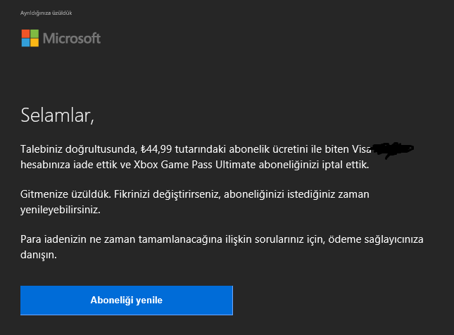 Pazar günü iade etmiş olduğum Xbox Game Pass'in parası kartıma gelmedi. Ne zaman gelir?