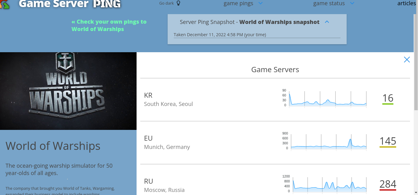 Ping times from your machine to World of Warships servers in all regionsgameserverping.com