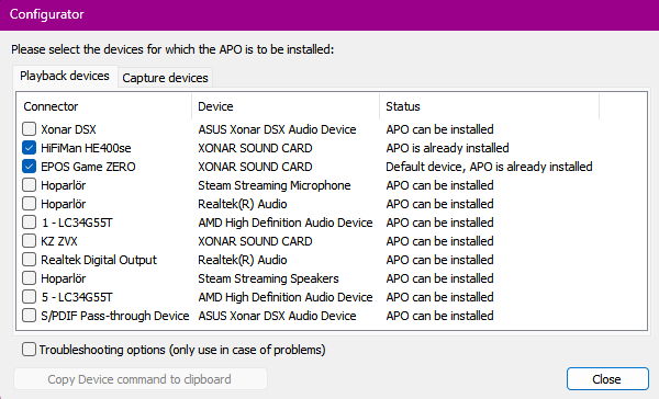 Listede EPOS Sennheiser Game Zero olarak geçecek. Onu seçelim. Sarıyla işaretlediğim seçeneği "Create a new equalization configuration" olarak işaretleyip "Use" a basalım.