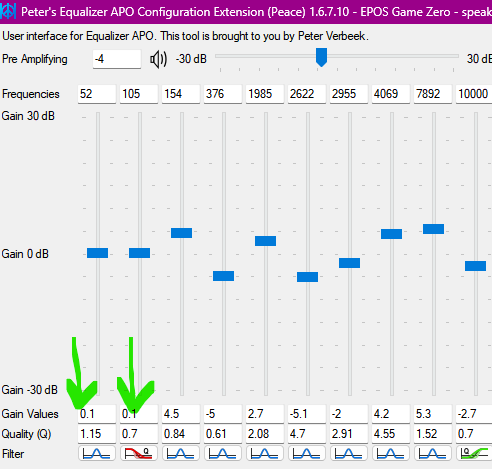 Basları bir tık daha gür versin diye ben en soldaki iki ayarı -'den 0.1'e çektim. Ses seviyesini yetersiz görürseniz yukardaki Pre Amplifying ayarını 0'a çekebilirsiniz.