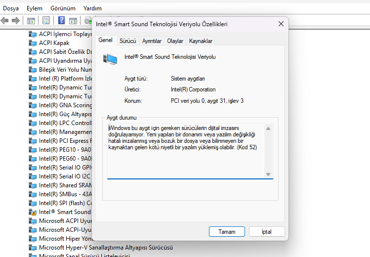 Aygıt Yöneticisi'nden ünlem işaretli sürücüyü kaldırın, sonra bu videodaki gibi Intel SST sürücüsünü kurmayı deneyin.