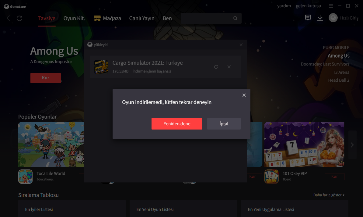 Bariswsk dedi: GameLoop indirdim fakat oyunu indirmeye çalışırken o hata çıkıyor. Fotoğraf koydum zaten. Genişletmek için tıkla... Birçok yöntem denedikten sonra Bluestack emülatörünü kurdum yüklendi. Nox ve Gameloop'a hala yüklenmiyor. Emülatör hatası da olabiliyor. Bariswsk dedi: GameLoop indirdim fakat oyunu indirmeye çalışırken o hata çıkıyor. Fotoğraf koydum zaten. Genişletmek için tıkla... Birçok yöntem denedikten sonra BlueStacks emülatörünü kurdum yüklendi. Nox ve GameLoop'a hala yüklenmiyor. Emülatör hatası da olabiliyor