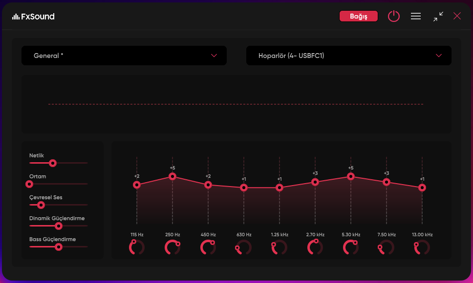 - Stok EQ ile sürücüleri sıradan durumda, aşağıda paylaştığım FxSound EQ ayarları ile EDM, House ve Dubstep tarzı parçalarda daha dolgun ve enstürman ayrımı yapılabilir hale geliyor.