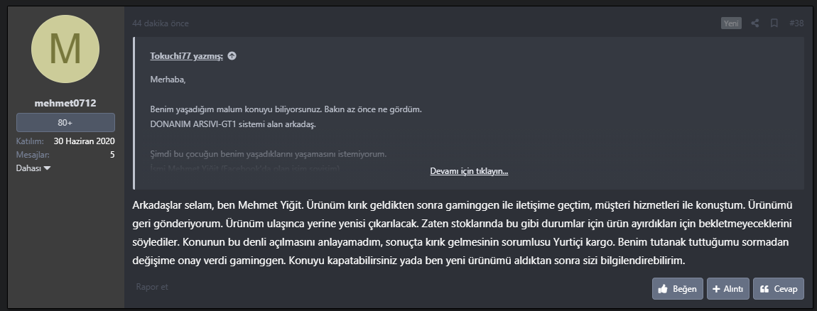 Mehmet Yiğit isimli müşteri bakın ne yazmış bana cevap olarak!