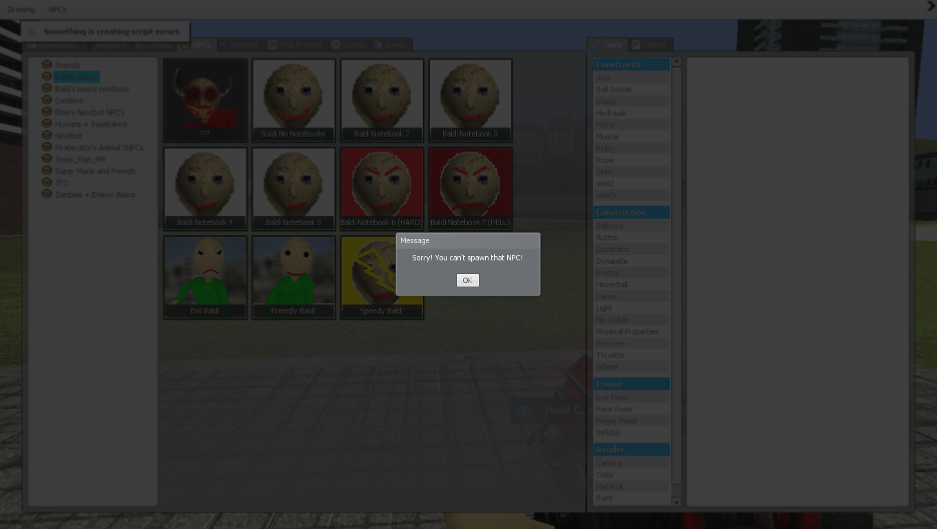 Garry's Mod'da nextbotlarım niye spawnlanmıyor? Steam'siz versiyon olduğu içinmi olmuyor? Veya "Something is creating script errors" yüzünden mi? Şöyle oluyor: