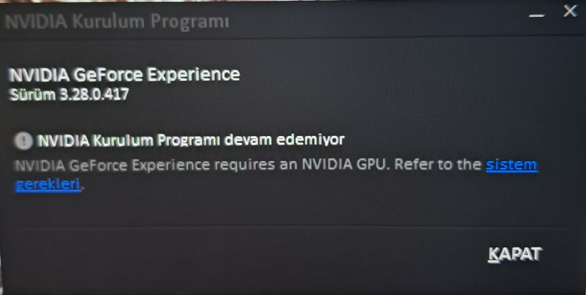 Başlıkta belirtmiş olduğum gibi yukarıdaki donanımdaki masaüstü bilgisayarıma GeForce Experience uygulmasını yüklerken aşağıda bırakmış olduğum hatayı alıyorum sebebi ve çözümünü bilen varsa yardımcı olabilir mi? Şimdiden teşekkür ederim.