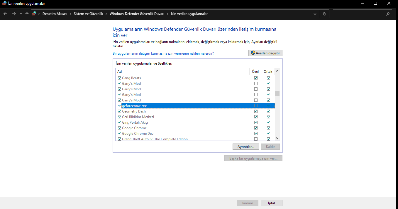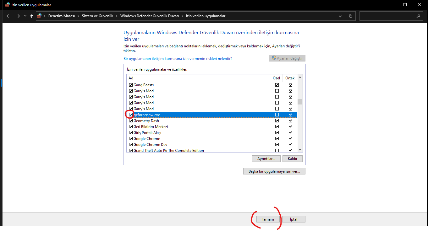 3) bastığınız an artık ayar değişikliği yapabilrsiniz buradan ( geforcenow.exe) seçeneğinin sol kutucukta tik olmadığını görüceksiniz sadece sol kutucuğun üstüne basın ve sağ en aşağıda tamam butonuna basın.