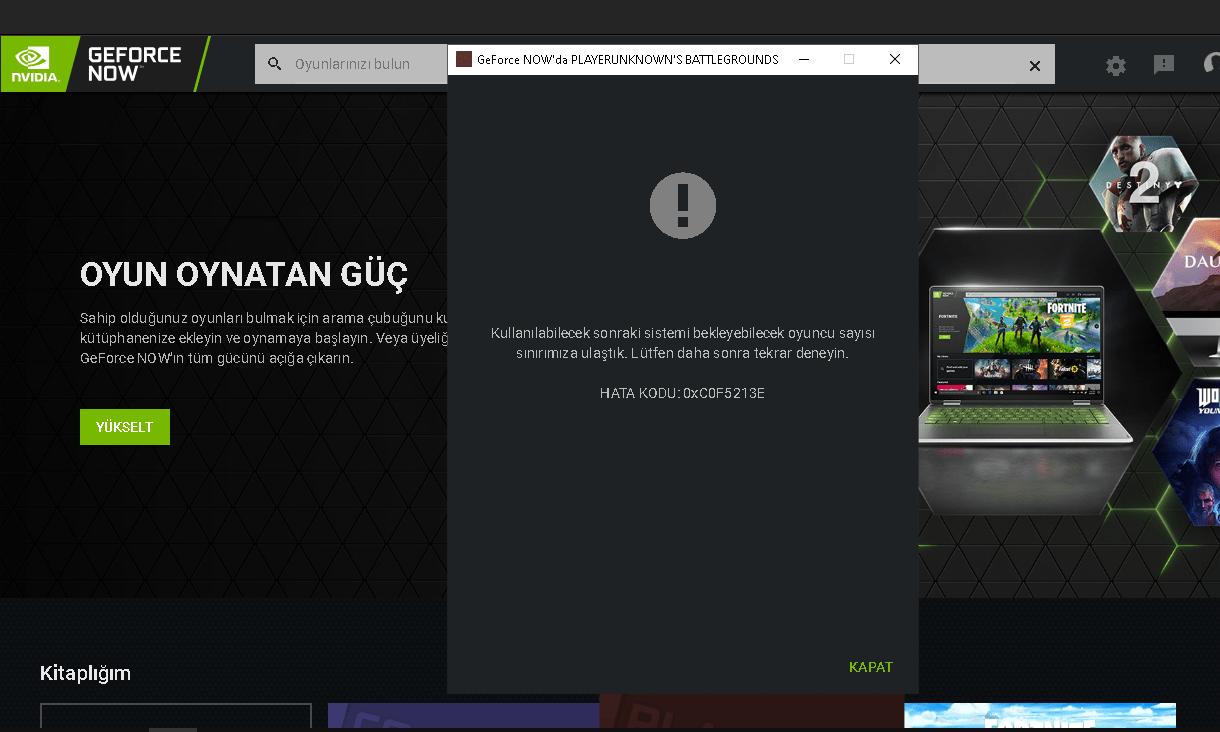 Bugün Geforce Now yüklemeye çalıştım yükledim fakat PUBG başta olmak üzere her oyunda 0xC0F5213E hatası veriyor. Çözümü nedir?