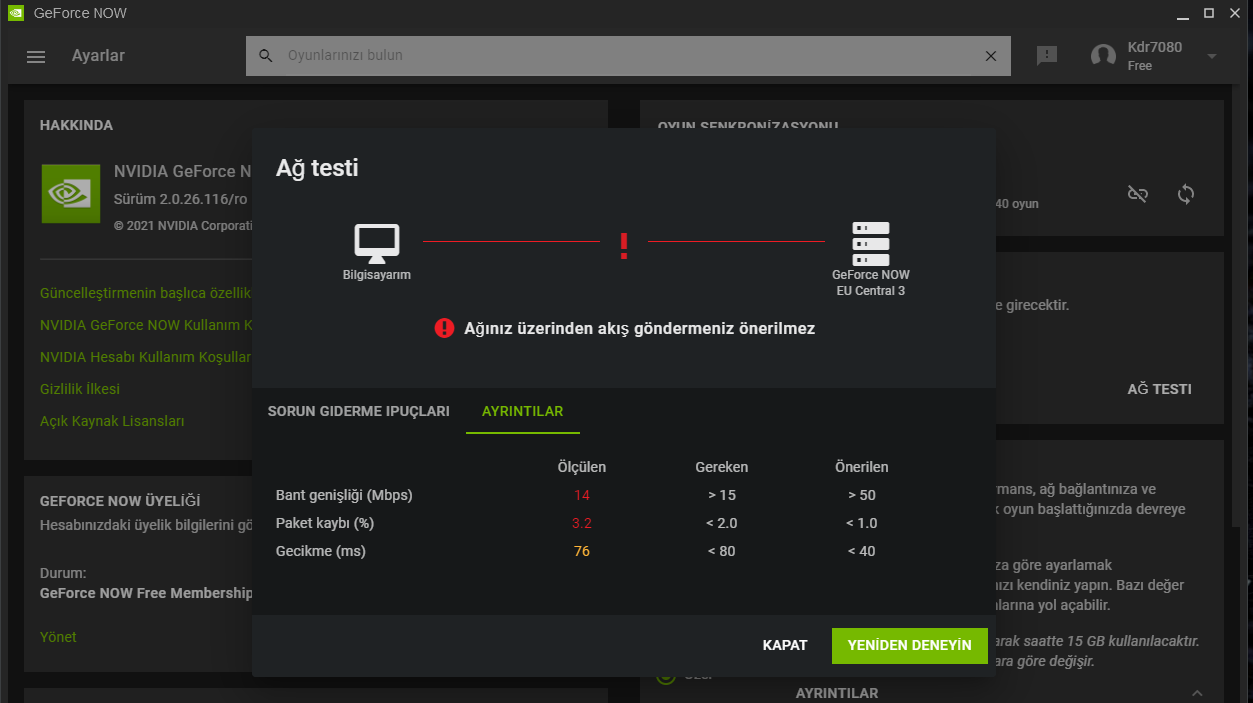 Arkadaşlar 100 Mbps internete sahibim ama GeForce Now'da çok kötü test sonuçları alıyorum ve oyun içinde çok takılma yaşıyorum. Test sonuçlarımı eke ekliyorum. Bu sorunu çözebilme şansım var mı?