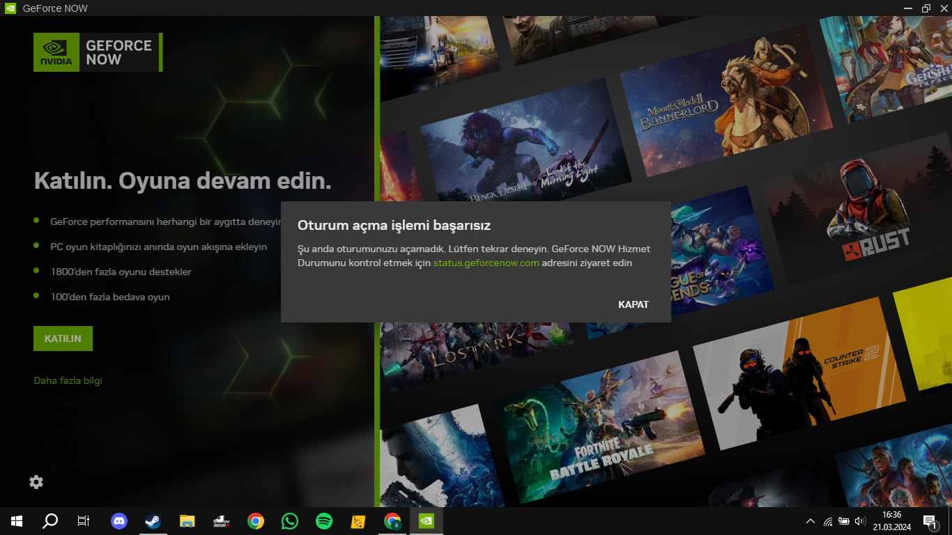 GeForce NOW hesabıma girmeye çalışınca böyle bir hata alıyorum çözümü nedir? Hesabımı yeni oluşturdum şu ana kadar hiç giremedim.