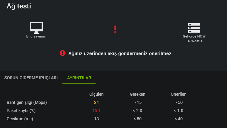 Düzgün bir internete sahip olmama rağmen GeForce NOW üzerinde paket kaybı ve düşük hız gözüküyor. Nedeni nedir? 2.4 GHz Wi-Fi ile bağlanıyorum ama 5 GHz olsa da böyle oluyor.