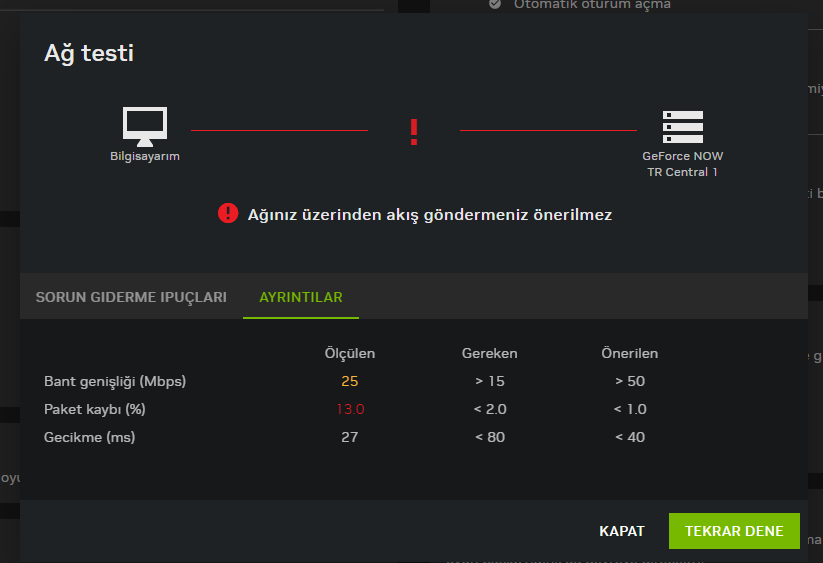 Hocam ben yeni üyelik satın aldım. Geforce nowda iken internet iyi, ping yok ancak ara ara bir anda paket kaybı yaşıyorum o da ekranda saniyelik takılmaya neden oluyor. Bundan kurtulmanın bir yolu yok mu ?Daha önce hiçbir oyun ya da streaming servislerinde internetimden dolayı hiçbir sorun yaşamadım ama yakın zamanda GFN denemek istediğimde hem paket kaybım hem de internet hızım anlamsız bir şekilde kötü sonuç veriyor.