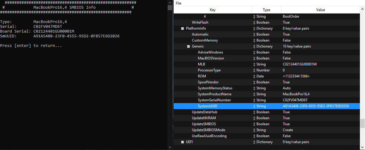 - Sonrasında ise SMBIOS çıktımızı, config dosyamızdaki ile değiştiriyoruz. Sırasıyla: