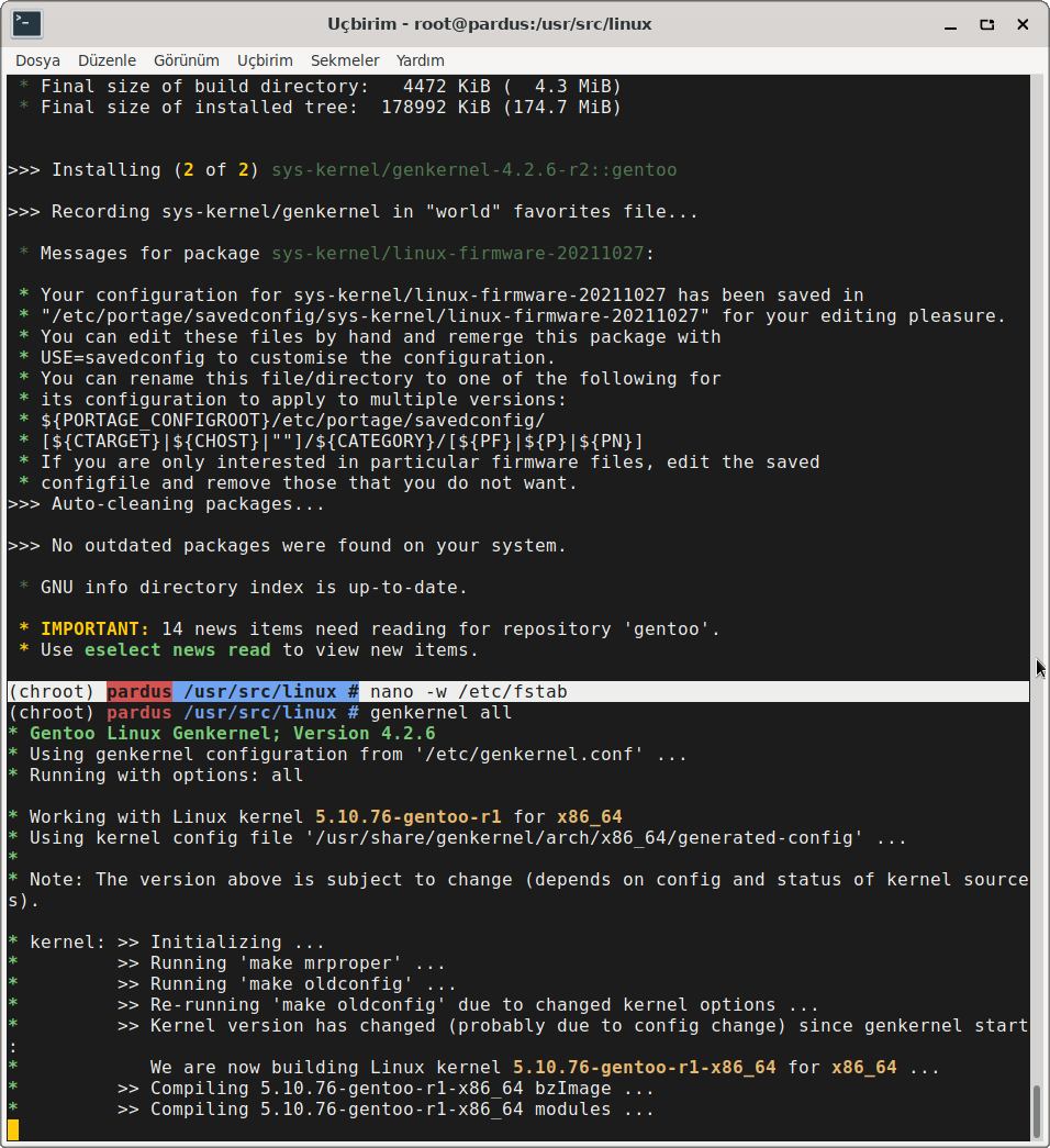 emerge --ask --verbose sys-kernel/genkernel yap bi bakalim. Olmazsa source /etc/profile yapip dene.Hem de nasilYaptım hocam. Kernel build ediyorum ama biraz uzun sürecek gibi. Eki Görüntüle 1244658