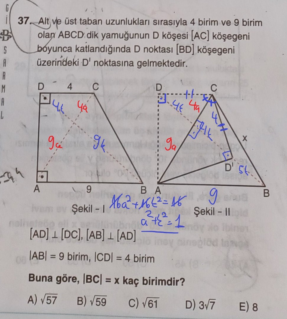 DAC Üçgenindeki öklidden 16=4a.13a dan gidersek direkt a²=4/13 buluruz, a²+k²=1'den k² de 9/13 gelir. Sadece bölye kısaltabildim onun dışında gerçekten uzun çözümlü bir soruymuş. Teşekkürler çözüm için.Cevap C mi?