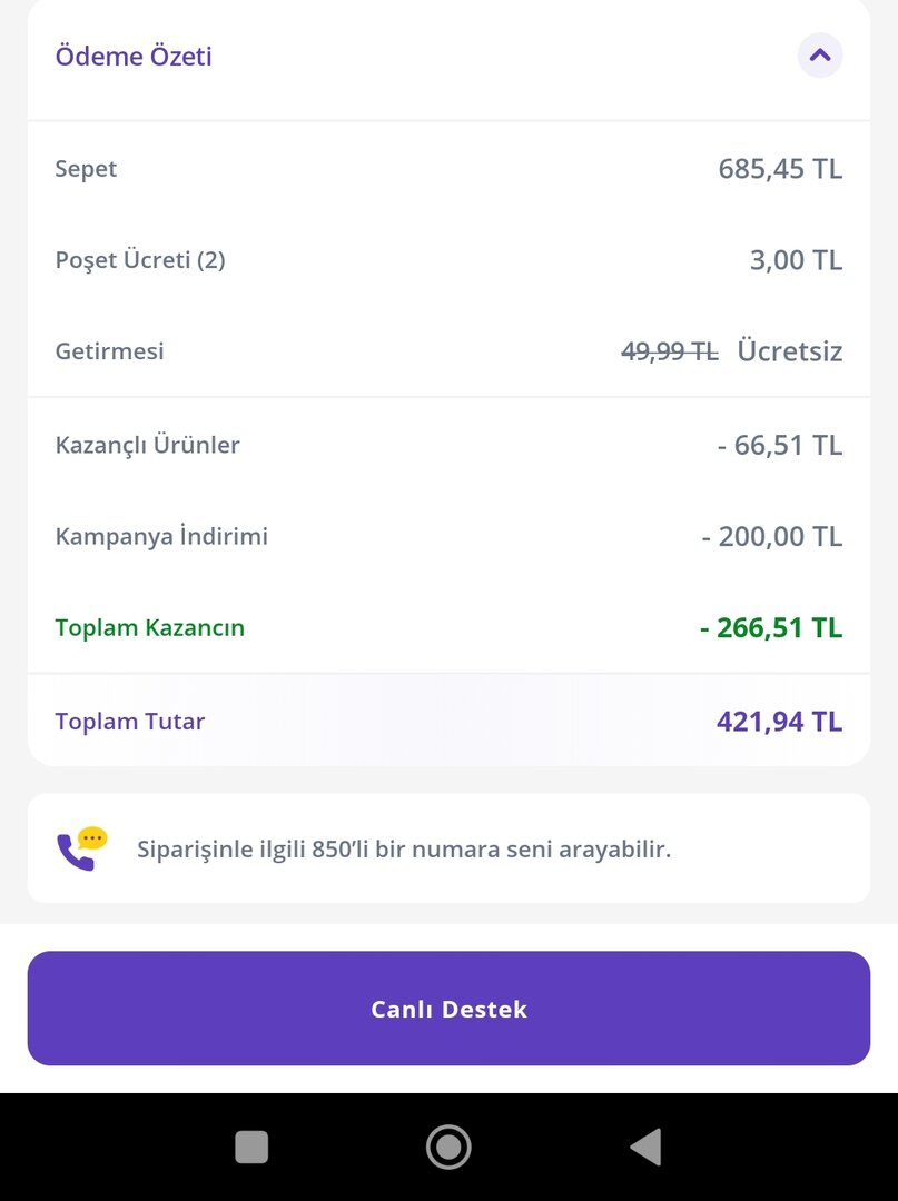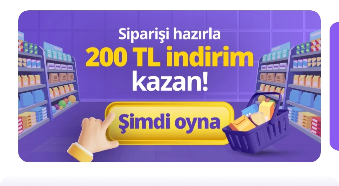 Arkadaşlar merhaba, Getir'de mini oyun var sepete ürün atıyorsunuz kolayca yapılıyor. Bana 600 TL sepet için 200 TL indirim verdi, getirme ücreti de yok. Faydalanmak isteyen olabilir diye paylaştım. Ürünler normalden daha pahalı ama market fiyatları ile indirimli halini kıyasladığımızda benim için yine de uyguna geldi. Bölgesel olabilir, kontrol etmek lazım.