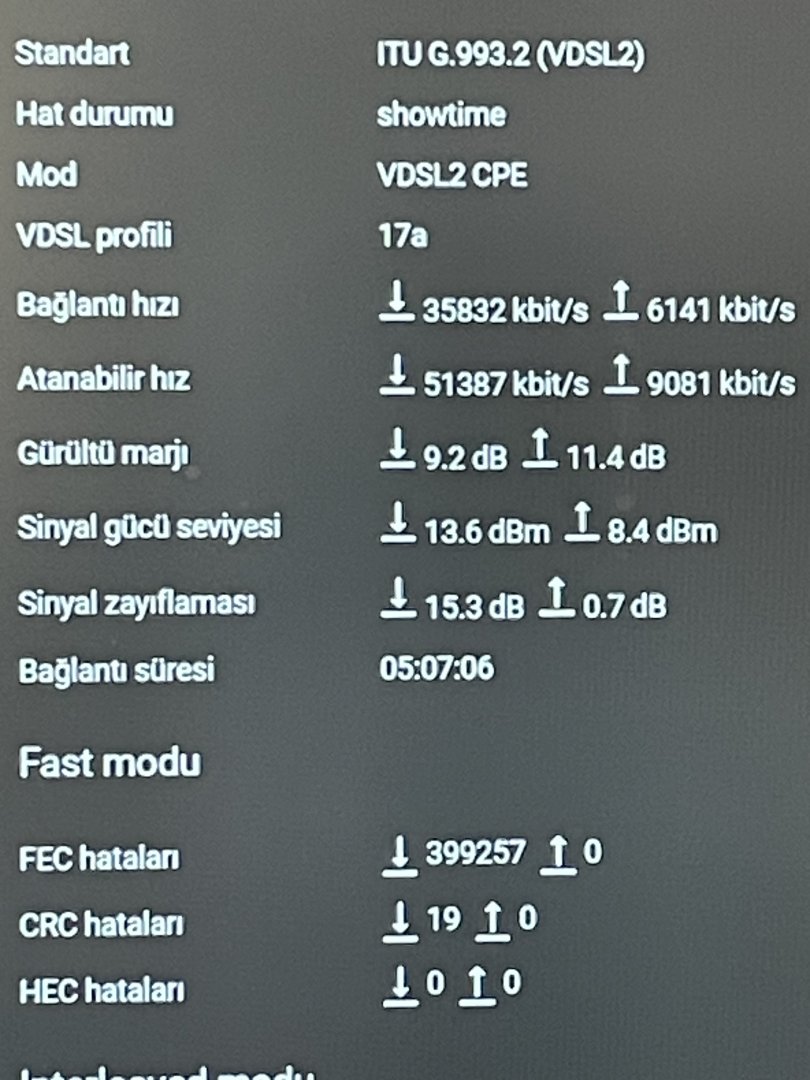 Merhaba. İyi Sosyaller. TT altyapısı ile kullandığım GIBIRNet internetimde akşamları upload hızım 6 Mbps görünüyor. Sabahları 9 Mbps yükseliyor. Değerler sürekli değişiyor. Ekteki görseldeki gibi CRC hatalarım yükseliyor, fec hataları zaten aldı başını gitti. Bilginiz varsa yardımcı olur musunuz? Modem değişikliği yaptım çözülmedi.