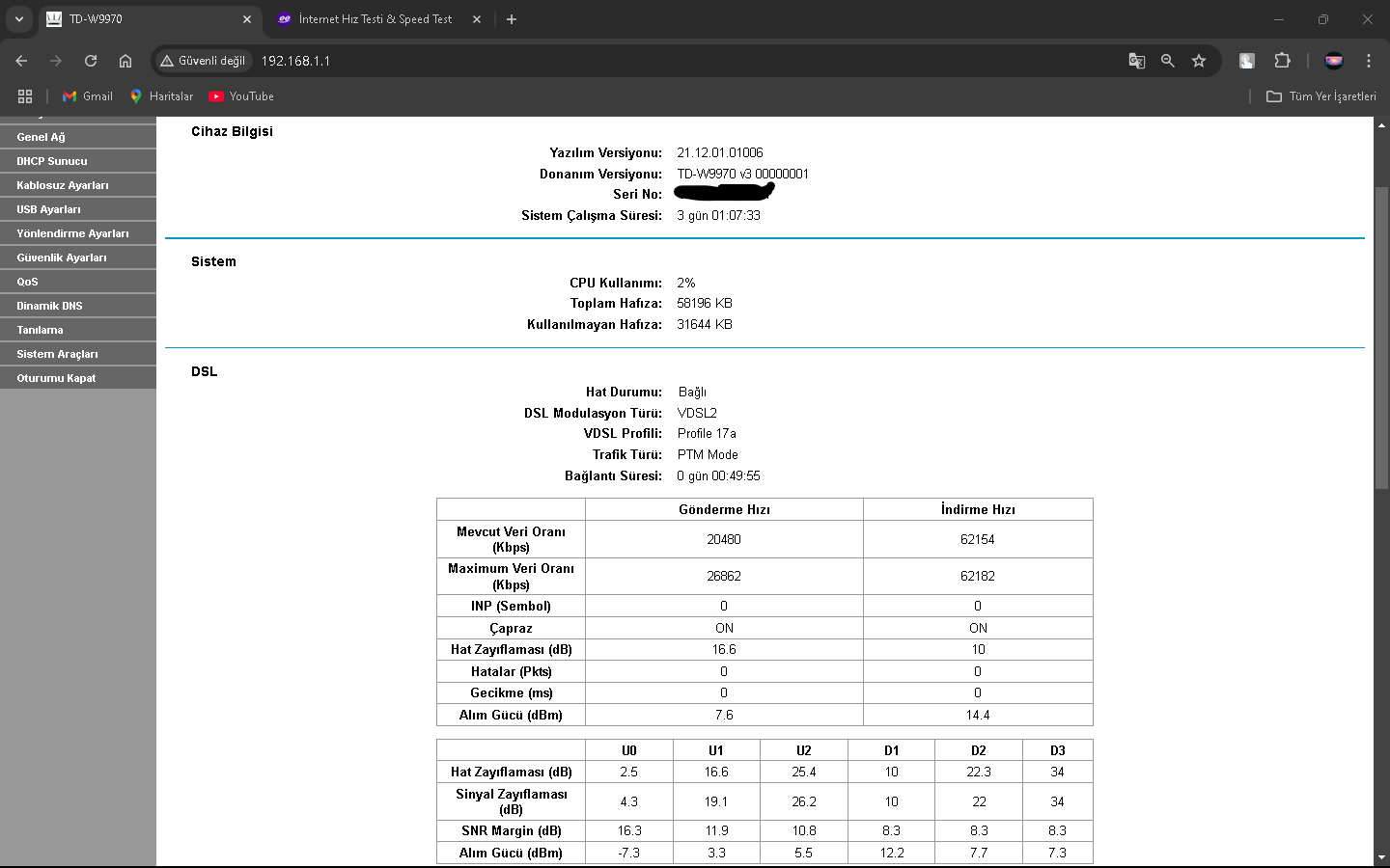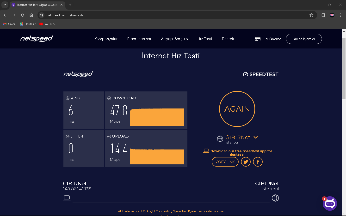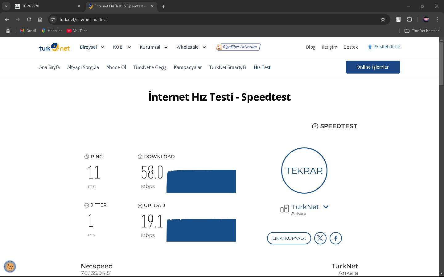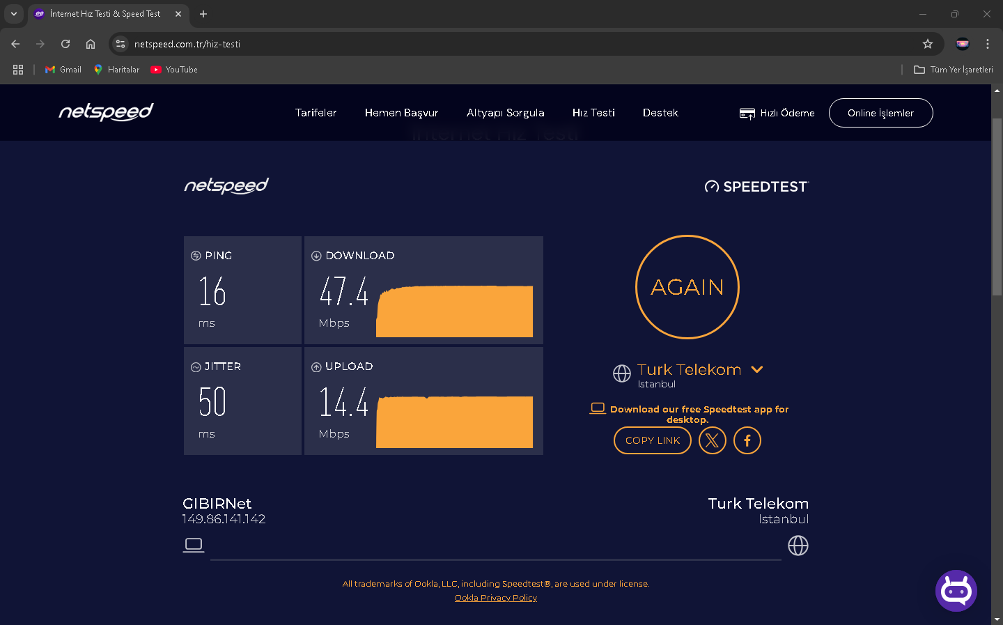 2024 Mart ayı sıralarında Netspeed ISS'ni kullanıyorduk ve fiyatlar fazla gelmeye başlayınca yeni ISS aramaya başladım(Netspeed 289 lira civarıydı sanırsam). Kısa bir aramayla GIBIRNet'i buldum ve fiyatı uygun bulduğumdan ve kötü bir ünü olmadığından geçiş yaptık (GIBIRNet 220 lira civarı geliyordu indirim falan filanla). O sıralarda modem arayüzünde Max. Download 51k ve upload 16k gözüküyordu. İlk başlarda GIBIRNet Netspeed'teki gibi hız alıyor ve kopma vesaire yaşamıyorduk. Bu son bir aydır (aralık 2024-ocak 2025) kopmalar, hız düşmesi ve ping (Apex Legends'te özellikle) yaşamaya başladım. CS2 Türk sunucularında bile Server'daki en yüksek ping alanlar arasındaydım, Netspeed'te durum tam tersiydi. GIBIRNet, hızı Türk Telekom'un önerdiği hız limitlerine sabitlemesine rağmen sonuç değişmedi. Yakın zamanda darıcada gaz patlaması oldu ve ilçe 1 hafta kadar doğalgazsız kaldı. Bunun duruma herhangi bir etkisi oldu mu bilemem. Karşılaştırmak için Netspeed'ten çıkış, GIBIRNet'e giriş, GIBIRNet'ten çıkış ve Netspeed'e geçişte hız testi yapıp, ekran resimlerini aldım. Bunun yarı sıra mart 2024'ten ocak 2025'e modem arayüzündeki Max. Download 62K. Ve upload 26k.'ya yükseldi. Netspeed ve GIBIRNet'te 100 Mbps'lik VDSL tarifeler kullanıyordum.