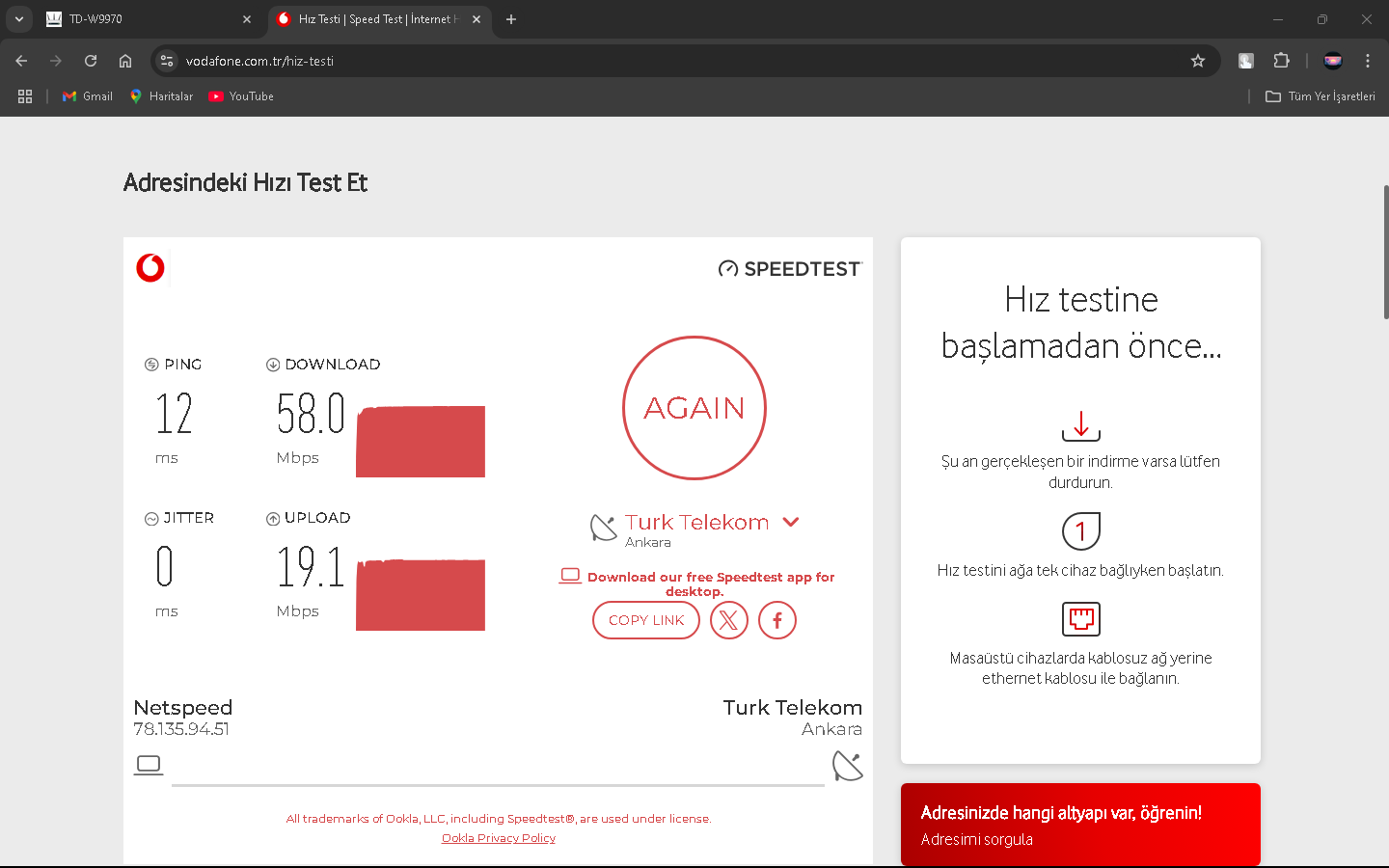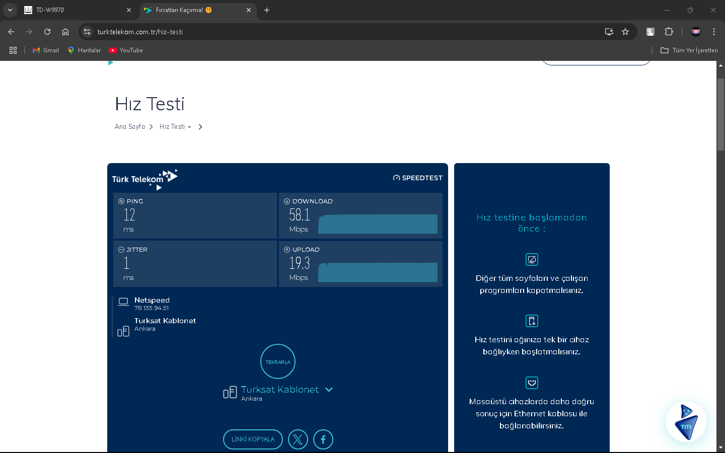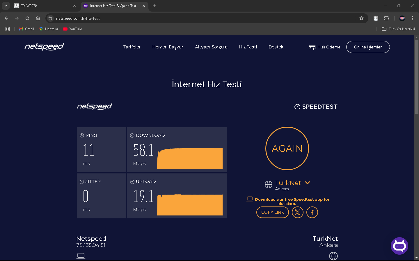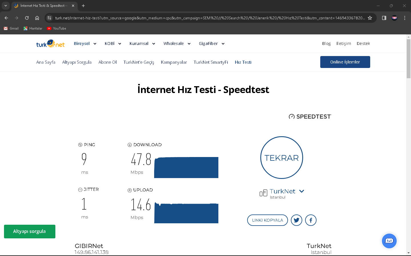 2024 Mart ayı sıralarında Netspeed ISS'ni kullanıyorduk ve fiyatlar fazla gelmeye başlayınca yeni ISS aramaya başladım(Netspeed 289 lira civarıydı sanırsam). Kısa bir aramayla GIBIRNet'i buldum ve fiyatı uygun bulduğumdan ve kötü bir ünü olmadığından geçiş yaptık (GIBIRNet 220 lira civarı geliyordu indirim falan filanla). O sıralarda modem arayüzünde Max. Download 51k ve upload 16k gözüküyordu. İlk başlarda GIBIRNet Netspeed'teki gibi hız alıyor ve kopma vesaire yaşamıyorduk. Bu son bir aydır (aralık 2024-ocak 2025) kopmalar, hız düşmesi ve ping (Apex Legends'te özellikle) yaşamaya başladım. CS2 Türk sunucularında bile Server'daki en yüksek ping alanlar arasındaydım, Netspeed'te durum tam tersiydi. GIBIRNet, hızı Türk Telekom'un önerdiği hız limitlerine sabitlemesine rağmen sonuç değişmedi. Yakın zamanda darıcada gaz patlaması oldu ve ilçe 1 hafta kadar doğalgazsız kaldı. Bunun duruma herhangi bir etkisi oldu mu bilemem. Karşılaştırmak için Netspeed'ten çıkış, GIBIRNet'e giriş, GIBIRNet'ten çıkış ve Netspeed'e geçişte hız testi yapıp, ekran resimlerini aldım. Bunun yarı sıra mart 2024'ten ocak 2025'e modem arayüzündeki Max. Download 62K. Ve upload 26k.'ya yükseldi. Netspeed ve GIBIRNet'te 100 Mbps'lik VDSL tarifeler kullanıyordum.