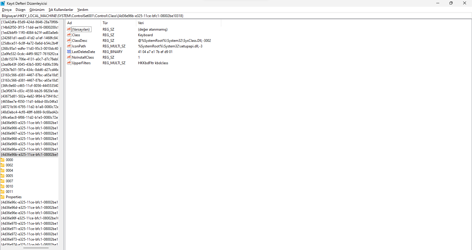 Daha sonra bu ekran görüntülerindeki UpperFilters isimli stringleri sadece mouclass ve kbdclass olacak şekilde düzenleyin. Sıkıntılı filtre sürücüsü bu şekilde devre dışı kalıyor.