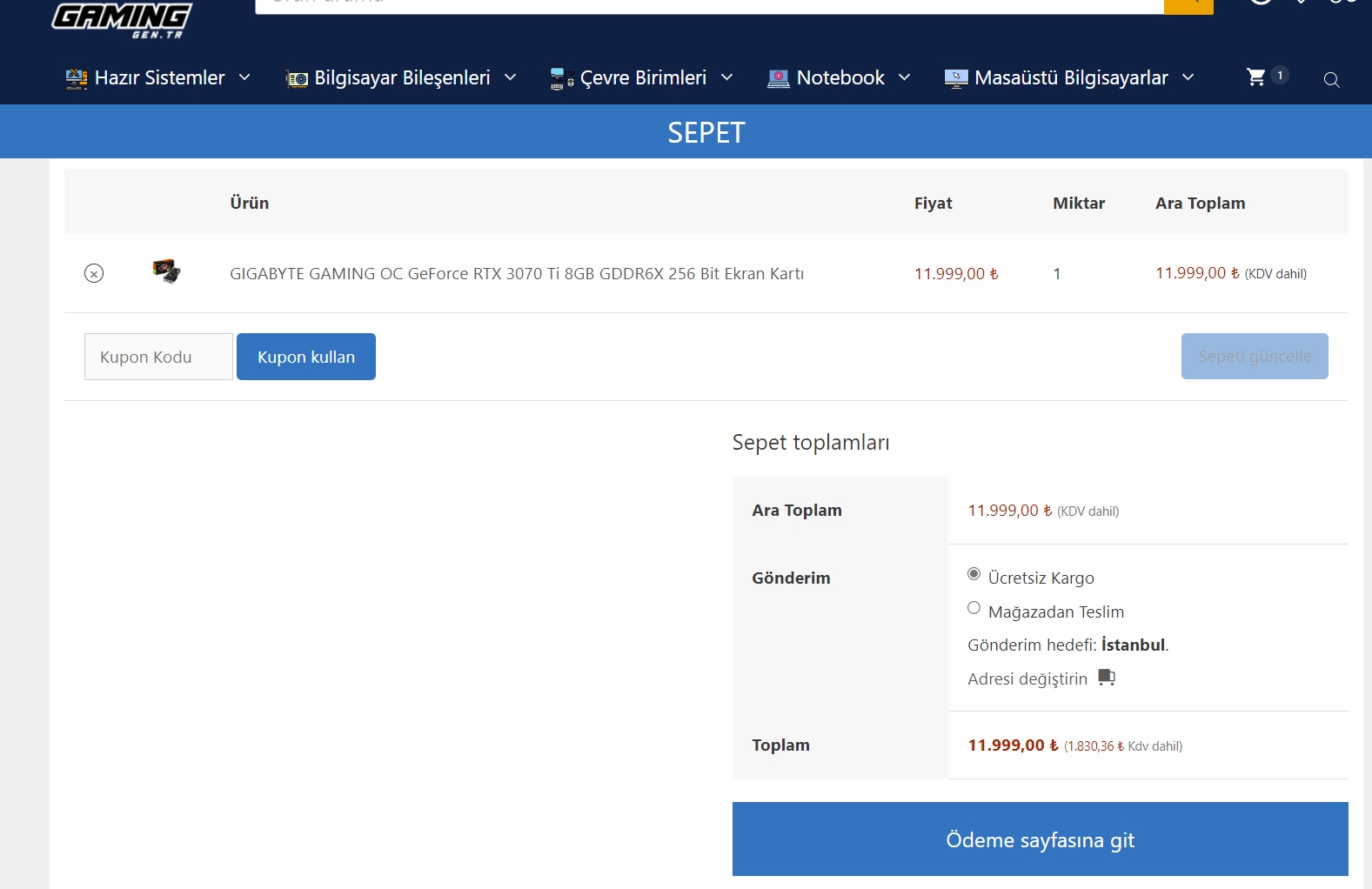 Gigabyte Gaming OC GeForce RTX 3070 Ti 8 GB GDDR6X 256 bit ekran kartı 11.999, 00 TL.