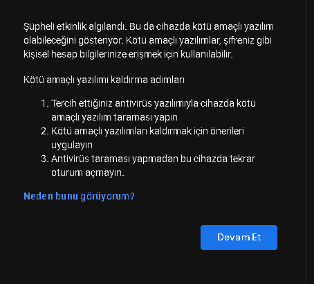 Cihazınız virüs yemiş. Google da o virüsü temizlemeden oturumu açmanıza izin vermiyor.