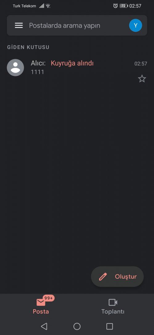 Gmail hesabıma e-posta gelmiyor. Birden fazla hesabım var. Diğerlerine e-postalar geliyor fakat en sık kullandığım hesaba kesinlikle posta gelmiyor. Mesela mobil uygulamada oluştur tuşuna basıp mesajımı gönderiyorum. Alıcı olarak ne seçersem seçeyim gönderilemedi yazıyor.
