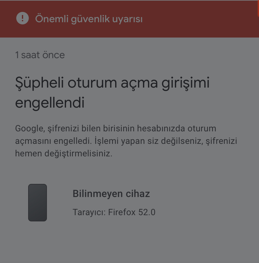 Dünden beri tüm Gmail hesaplarıma giriş uyarısı geliyor, Google konumlar yabancı olduğu için izin vermiyor girişlere ancak devamlı aralıklarla girilmeye çalışılıyor. Girmeye çalışılan yer Hollanda Firefox 52.0 yazıyor ve tüm tüm hesaplarımda aynı. İşin ilginç yanı şifremi değiştirdiğimden yaklaşık 10dk sonra tekrar yeni şifremle de giriş yapılmaya çalışıldığı Google'ın engellediği uyarısı geliyor. Yahminim masaüstü bilgisayarıma keylogger bulaşmıştır ancak şifremi sadece IPhone'dan değiştirdim bu uyarılardan sonra ve yine uyarı geldi dediğim gibi. Ne yapmam lazım? Bir hesap olsa kafama bu kadar takmam ancak gecenin 4'ünde bile uyarı geldi.