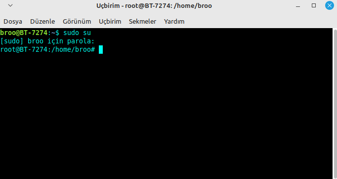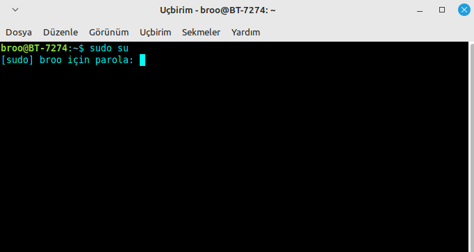Terminale, "root" yetkisi için sudo su yazdığımız da bize şu şekilde parola soruyor.