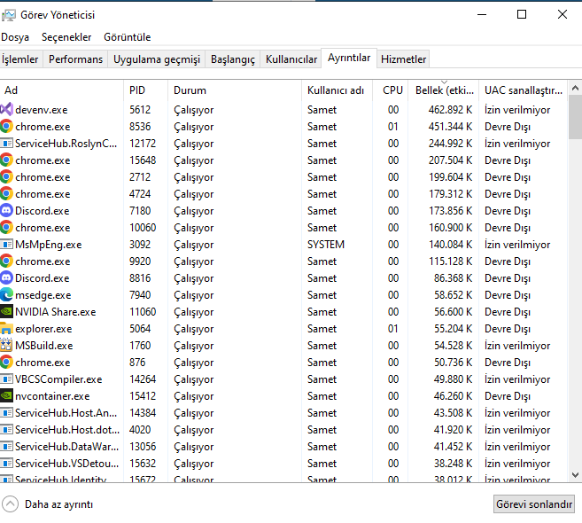 Performans bölümünden baktığımda RAM kullanımı böyle: