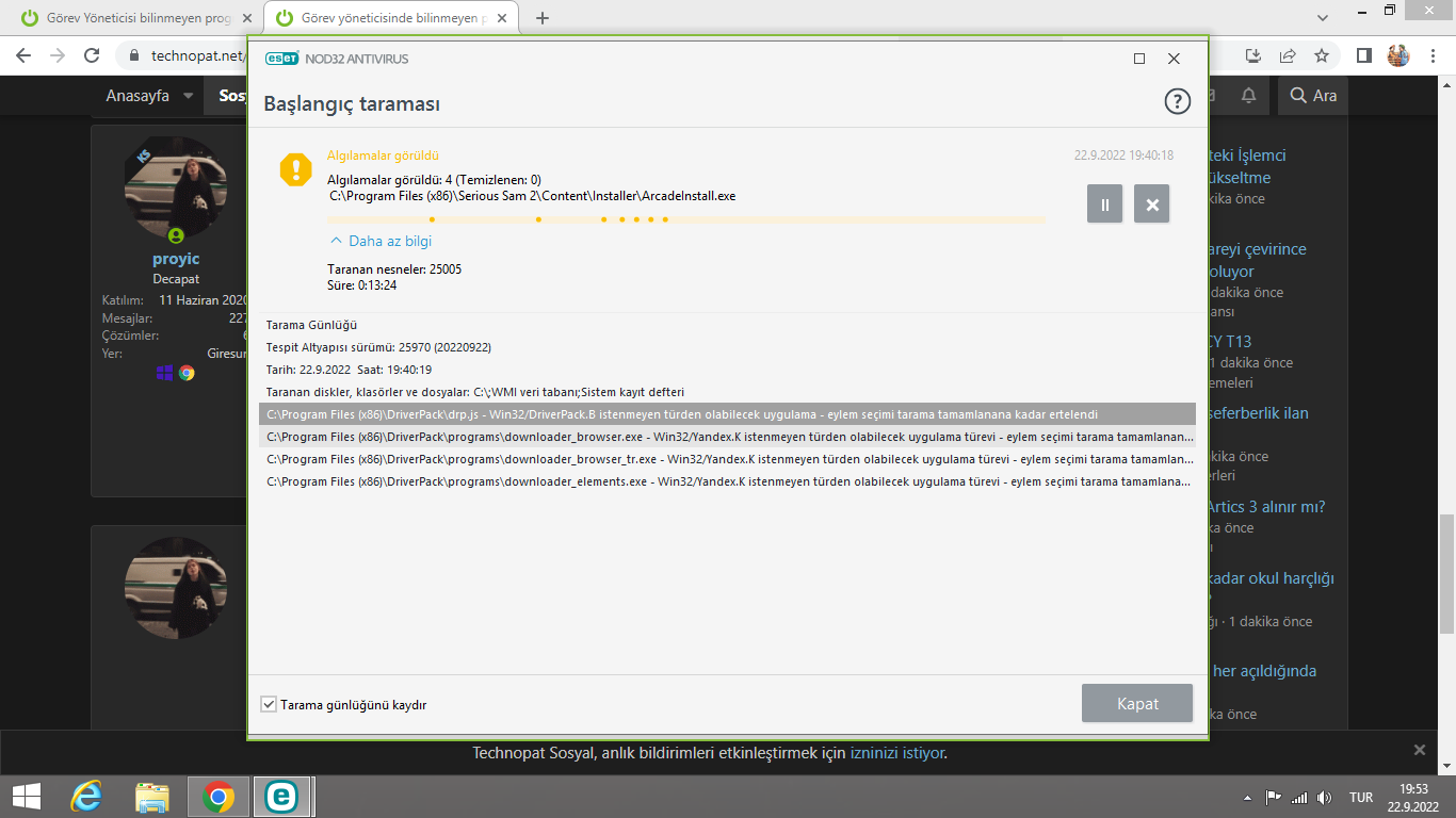Az önce oto Defender kapandı ESET'le açtım geri.