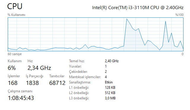 ÇözüldüGörev yöneticisinde i3-3110M çalışma zamanı sıfırlanmıyor