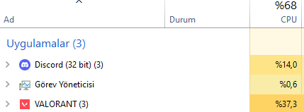 İşte 3 tane Discord açıkmış gibi, 3 tane Valorant açıkmış gibi hareket ediyor. Az önce de Spotify'dan 6 tane açıkmış gibi gözüküyordu ve CPU kullanımını buna göre yapıyordu. Yanlış mı biliyorum, bilmiyorum fakat böyle değerler almayacağımı biliyorum, işlemcimi biliyorum. Bunun sebebi nedir, nasıl çözebiliriz?