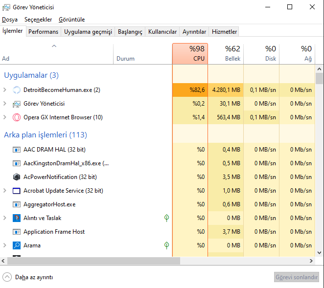 İşlemcim neredeyse %100 kullanılıyor ve kullanan uygulamalar burada gözüküyor. İşlemlere bakınca işlemcinin maksimun 85'i kullanılması lazımken %98 kullanılıyor gözüküyor.