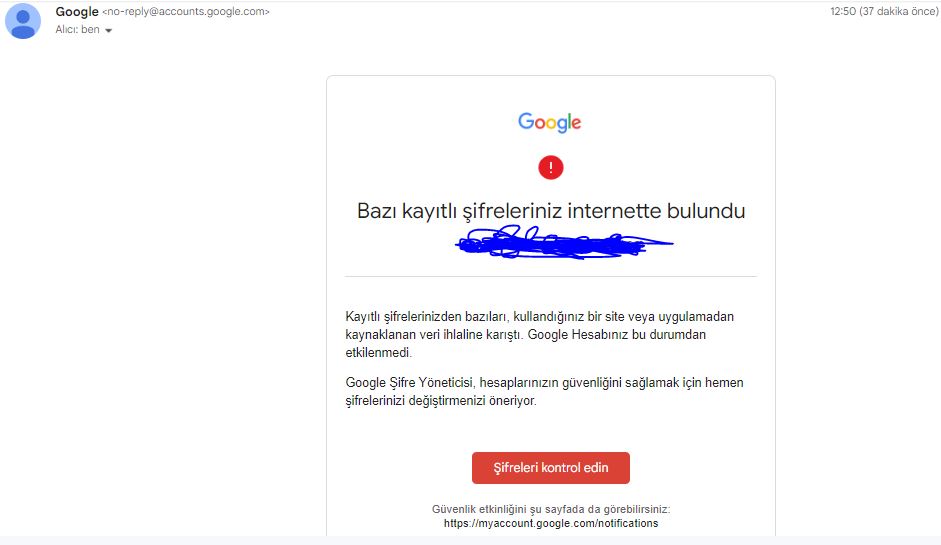 Merhaba. Bir mail aldım. Bazı kayıtlı şifreleriniz internette bulundu. Diyordu. Fotoğrafın tam hali de bu: