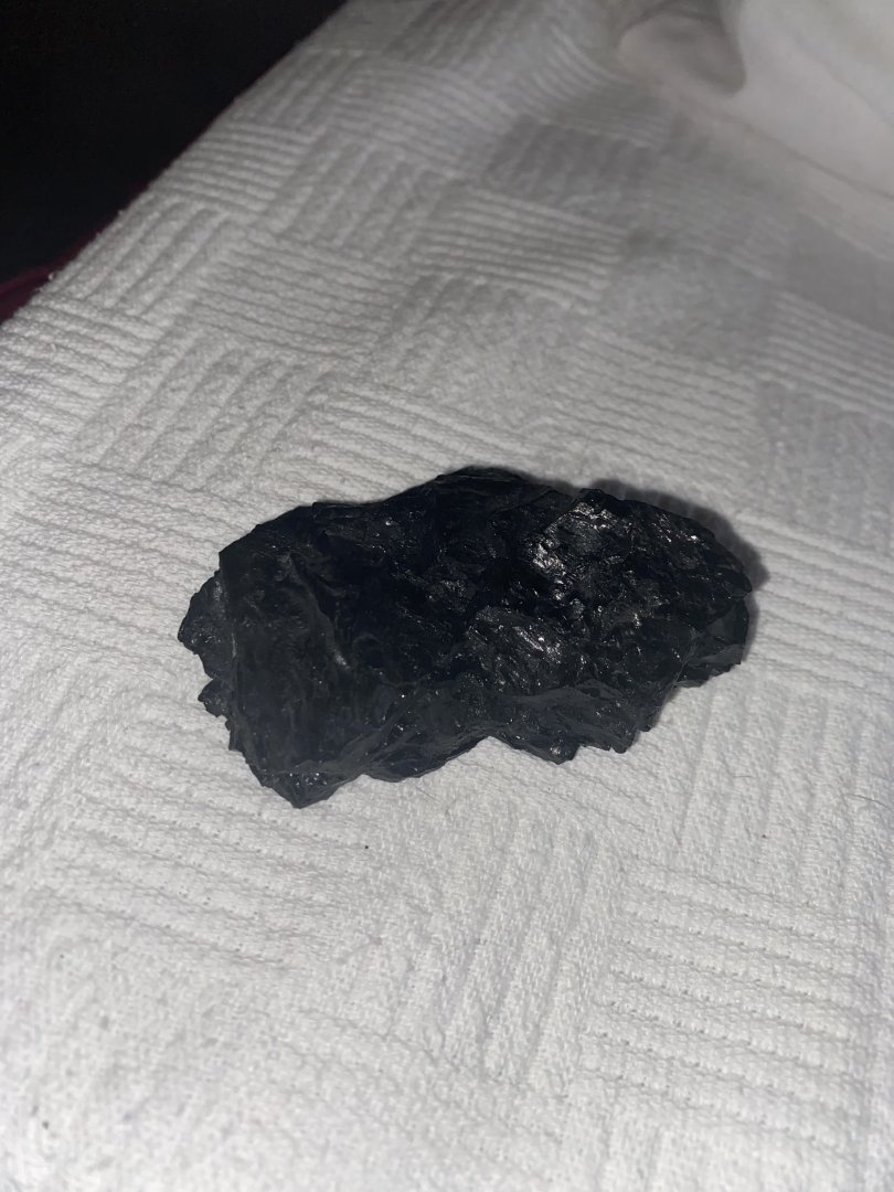 Büyük olan taşın bazı bolgelerı elmas gibi parlıyor, küçük olan taşın rengi ise parlak bir siyah ve elle kırılabilir. Bir de hafif.