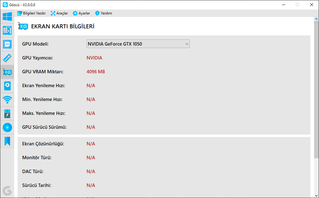 Değiştirdim, artık ekran kartı dışındakileri doğru gösteriyor ancak ekran kartı bilgilerini hala göstermiyor. Başta uyarı da vermedi.