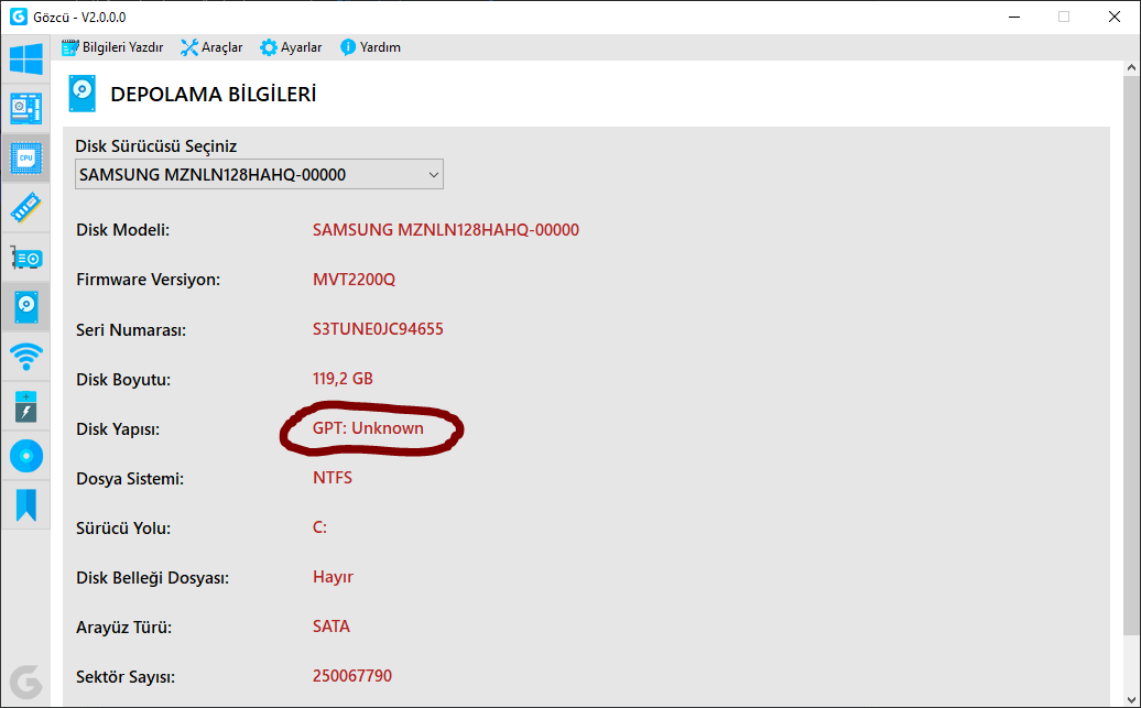 Kısmında disk yapısı "GPT: Unknown" olarak görünüyor, normal mi?